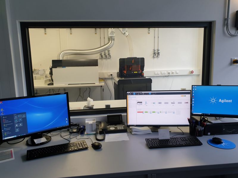 Das Labor zur Probenanalyse mittels Kopplung eines Lasers mit einem Massenspektrometer nutzt ein Agilent 8900 Tripel-Quadrupol-Massenspektrometer mit eingebauter Reaktionszelle (verwendet werden aktuell Helium, Ammoniak, Sauerstoff und Lachgas) und induktiv gekoppeltem Plasma als Ionenquelle (TQ-ICP-MS bzw. QQQ-ICP-MS).