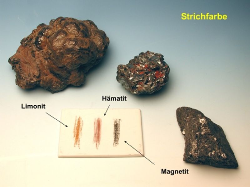 Die Strichfarbe wird durch Zerreiben des zu untersuchenden Minerals auf einer unglasierten Porzellanoberfläche erzeugt. Das fein pulverisierte Mineral fremdgefärbter, d.h. allochromatischer Minerale ist farblos, während eigengefärbte, d.h. idiochromatische Minerale einen jeweils speziestypischen Strich hinterlassen.